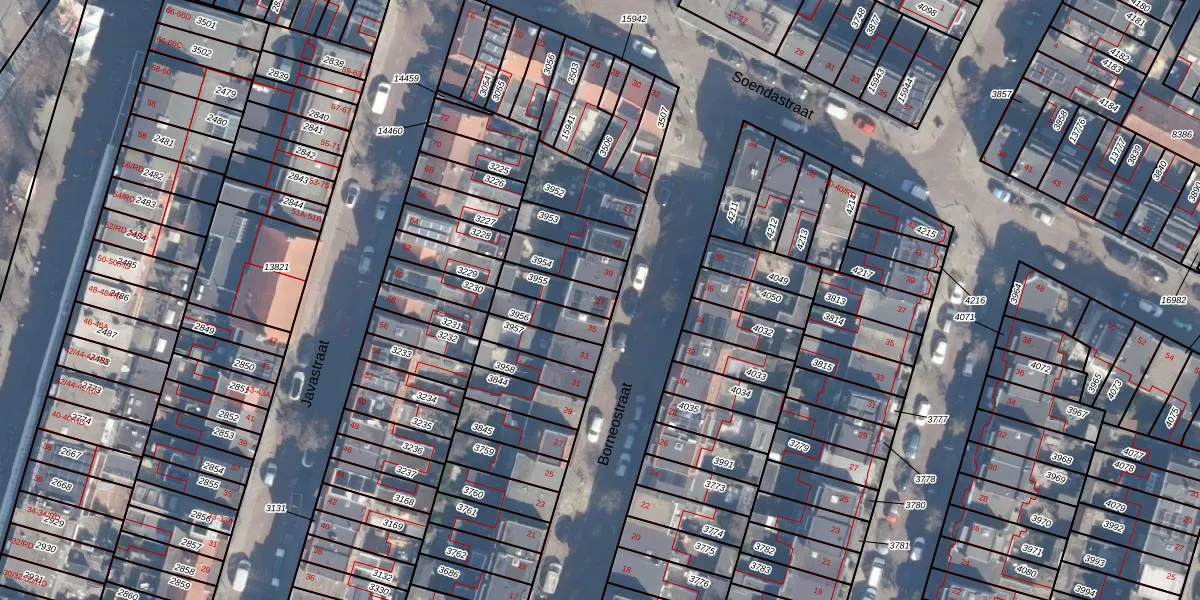Het perceel waarop Borneostraat 37 staat heeft een oppervlakte van 91 m². Dit is een klein perceel. De perceeloppervlakte wordt geregistreerd door het Kadaster. Gedetailleerde informatie over de maten van dit perceel kunt u vinden in het rapport Kadastrale kaart met maatvoering van Borneostraat 37.