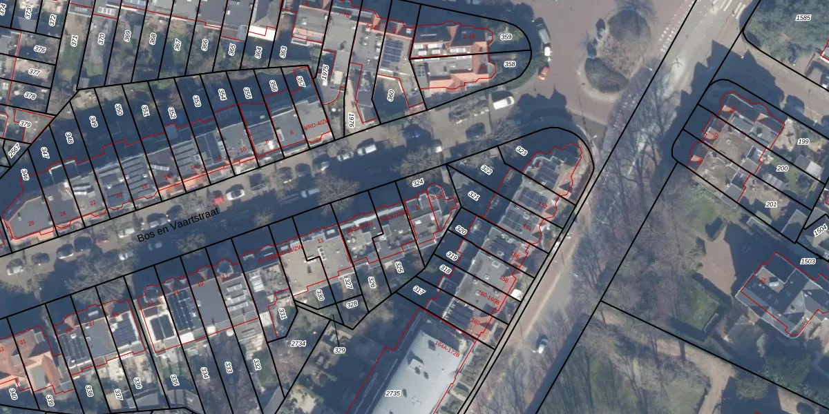 Bos en Vaartstraat 5 is gelegen op kadastraal perceel HLM02S324. Deze kadastrale aanduiding is uniek en wordt gebruikt door het Kadaster om eigendomsrechten en andere zakelijke rechten vast te leggen. Het perceel maakt onderdeel uit van de kadastrale gemeente Haarlem.
