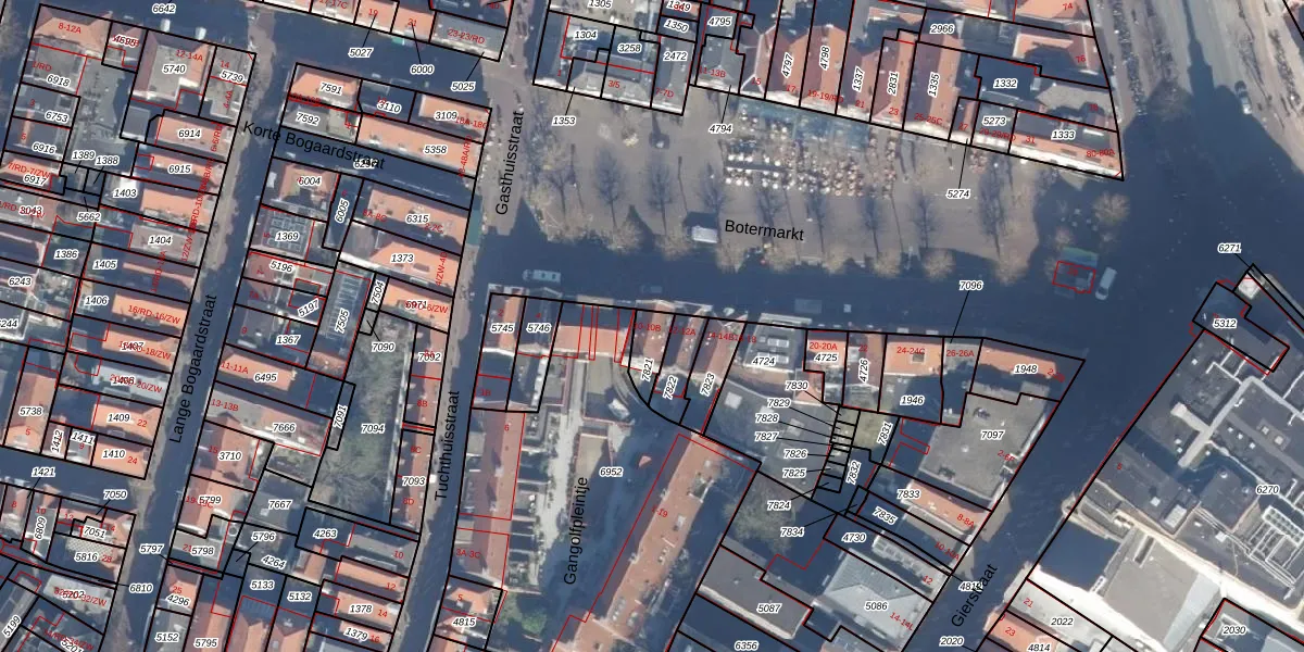 Het perceel waarop Botermarkt 10 staat heeft een oppervlakte van 70 m². Dit is een klein perceel. De perceeloppervlakte wordt geregistreerd door het Kadaster. Gedetailleerde informatie over de maten van dit perceel kunt u vinden in het rapport Kadastrale kaart met maatvoering van Botermarkt 10.