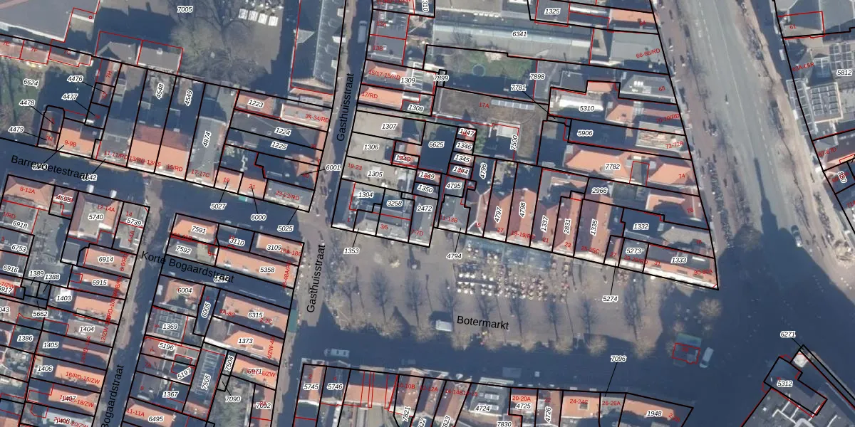Het perceel waarop Botermarkt 7-D staat heeft een oppervlakte van 62 m². Dit is een klein perceel. De perceeloppervlakte wordt geregistreerd door het Kadaster. Gedetailleerde informatie over de maten van dit perceel kunt u vinden in het rapport Kadastrale kaart met maatvoering van Botermarkt 7-D.