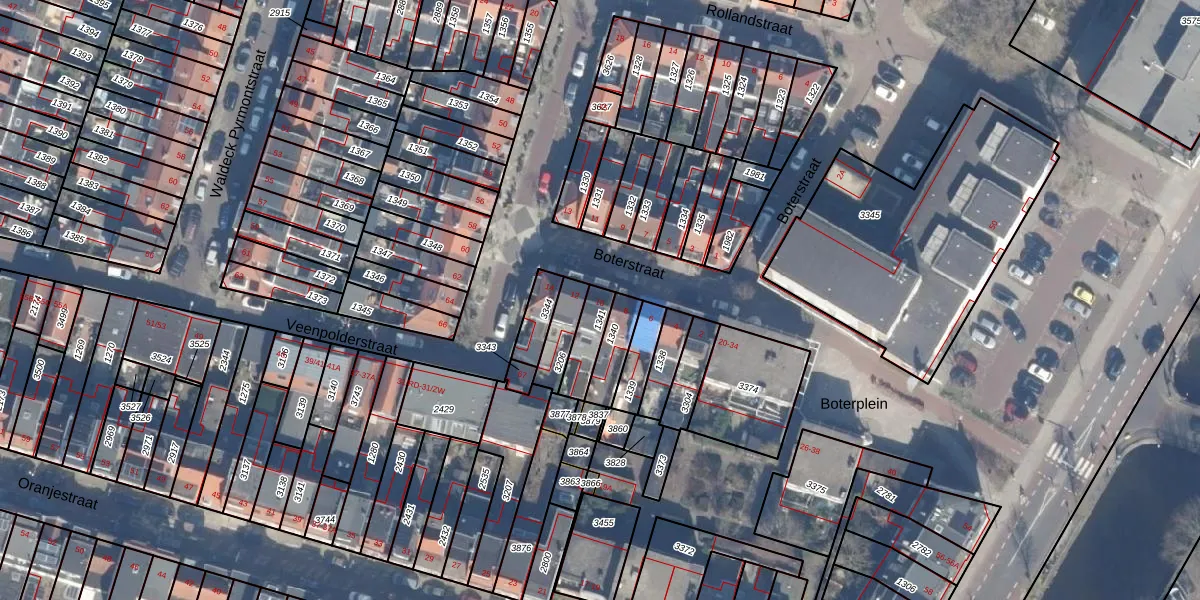 Het perceel waarop Boterstraat 10 staat heeft een oppervlakte van 85 m². Dit is een klein perceel. De perceeloppervlakte wordt geregistreerd door het Kadaster. Gedetailleerde informatie over de maten van dit perceel kunt u vinden in het rapport Kadastrale kaart met maatvoering van Boterstraat 10.