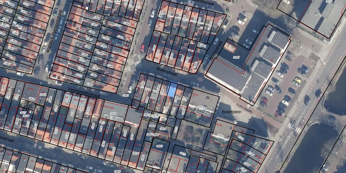 Het perceel waarop Boterstraat 6 staat heeft een oppervlakte van 83 m². Dit is een klein perceel. De perceeloppervlakte wordt geregistreerd door het Kadaster. Gedetailleerde informatie over de maten van dit perceel kunt u vinden in het rapport Kadastrale kaart met maatvoering van Boterstraat 6.