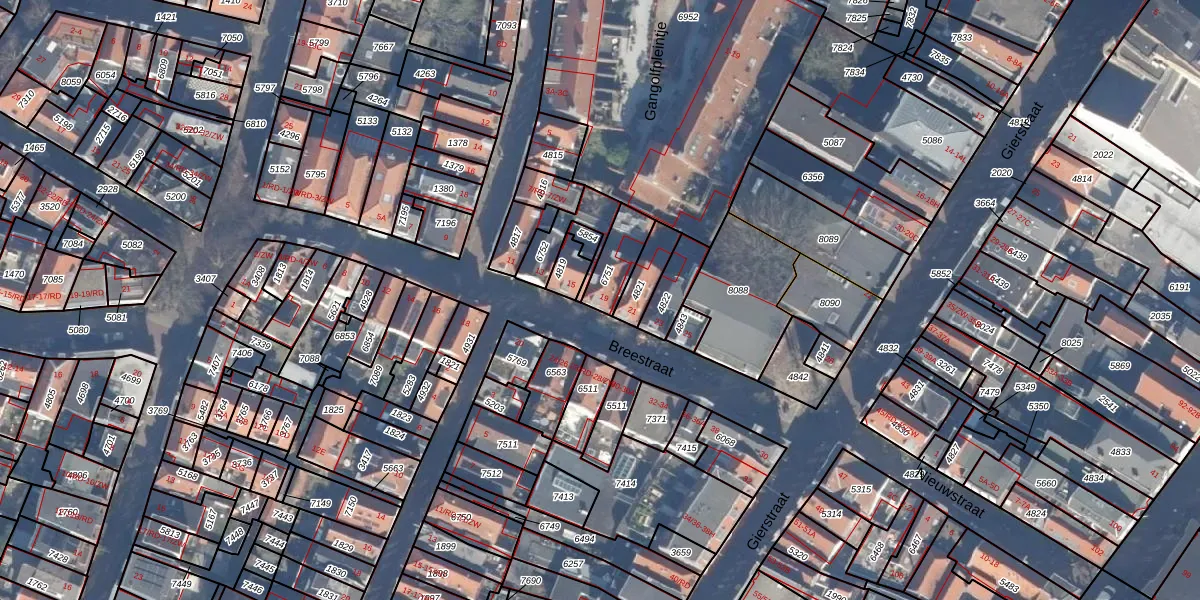 Het perceel waarop Breestraat 19 staat heeft een oppervlakte van 98 m². Dit is een klein perceel. De perceeloppervlakte wordt geregistreerd door het Kadaster. Gedetailleerde informatie over de maten van dit perceel kunt u vinden in het rapport Kadastrale kaart met maatvoering van Breestraat 19.