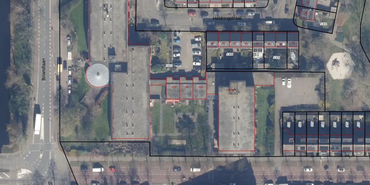 Het perceel waarop Briandlaan 261 staat heeft een oppervlakte van 9445 m². Dit is een zeer groot perceel. De perceeloppervlakte wordt geregistreerd door het Kadaster. Gedetailleerde informatie over de maten van dit perceel kunt u vinden in het rapport Kadastrale kaart met maatvoering van Briandlaan 261.
