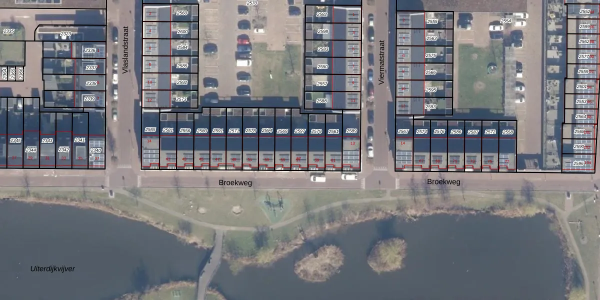 Broekweg 57 is gelegen op kadastraal perceel HLM02Q2597. Deze kadastrale aanduiding is uniek en wordt gebruikt door het Kadaster om eigendomsrechten en andere zakelijke rechten vast te leggen. Het perceel maakt onderdeel uit van de kadastrale gemeente Haarlem.
