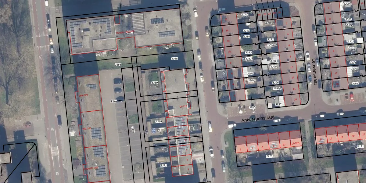 Het perceel waarop Brusselstraat 19 staat heeft een oppervlakte van 430 m². Dit is een groot perceel. De perceeloppervlakte wordt geregistreerd door het Kadaster. Gedetailleerde informatie over de maten van dit perceel kunt u vinden in het rapport Kadastrale kaart met maatvoering van Brusselstraat 19.