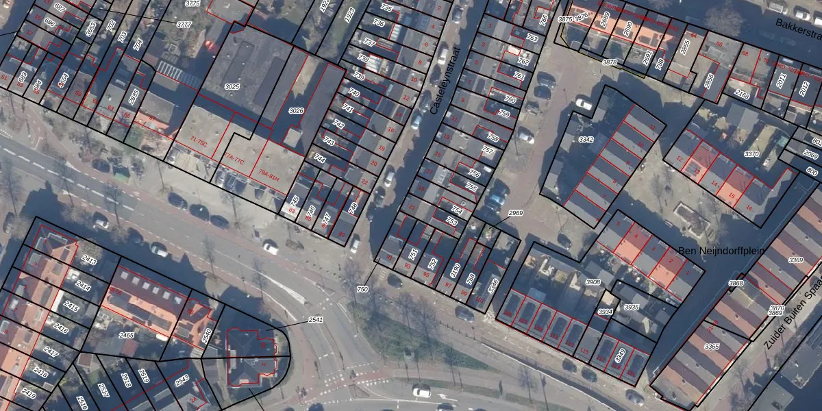Het perceel waarop Casteleynstraat 21 staat heeft een oppervlakte van 79 m². Dit is een klein perceel. De perceeloppervlakte wordt geregistreerd door het Kadaster. Gedetailleerde informatie over de maten van dit perceel kunt u vinden in het rapport Kadastrale kaart met maatvoering van Casteleynstraat 21.