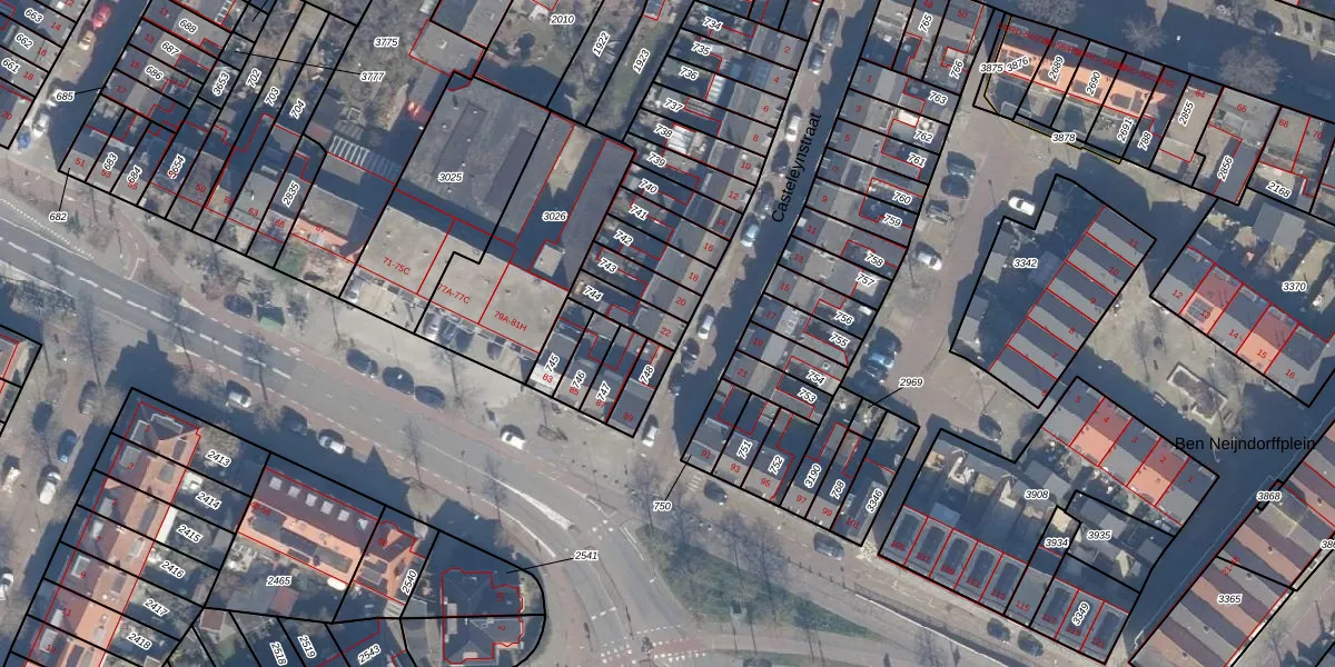 Het perceel waarop Casteleynstraat 22 staat heeft een oppervlakte van 85 m². Dit is een klein perceel. De perceeloppervlakte wordt geregistreerd door het Kadaster. Gedetailleerde informatie over de maten van dit perceel kunt u vinden in het rapport Kadastrale kaart met maatvoering van Casteleynstraat 22.