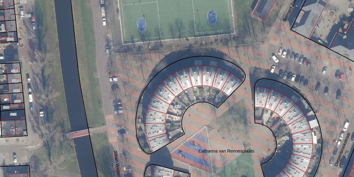 Het perceel waarop Catharina van Rennesplaats 6 staat heeft een oppervlakte van 1843 m². Dit is een zeer groot perceel. De perceeloppervlakte wordt geregistreerd door het Kadaster. Gedetailleerde informatie over de maten van dit perceel kunt u vinden in het rapport Kadastrale kaart met maatvoering van Catharina van Rennesplaats 6.