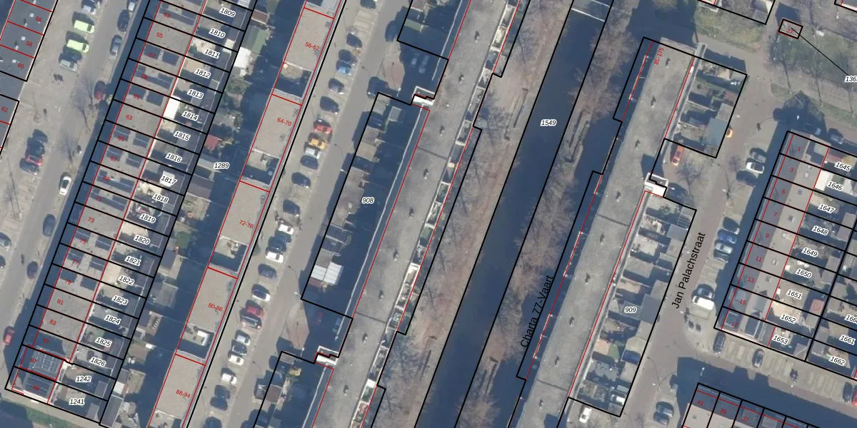 Het perceel waarop Charta 77-Vaart 102 staat heeft een oppervlakte van 2968 m². Dit is een zeer groot perceel. De perceeloppervlakte wordt geregistreerd door het Kadaster. Gedetailleerde informatie over de maten van dit perceel kunt u vinden in het rapport Kadastrale kaart met maatvoering van Charta 77-Vaart 102.