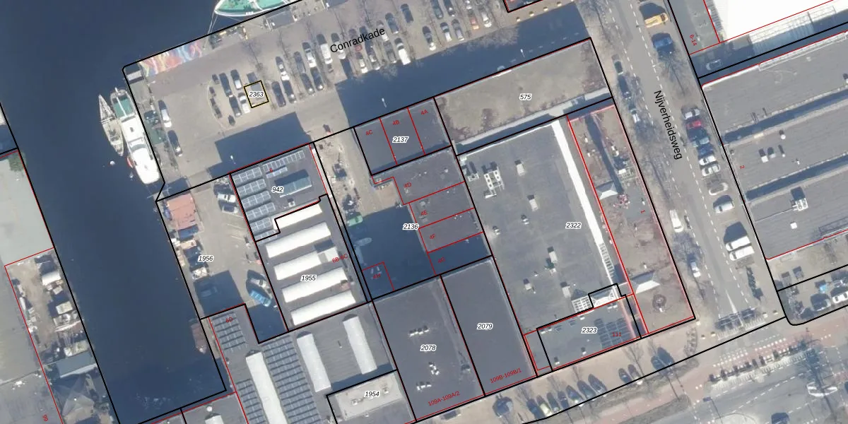Het perceel waarop Conradkade 4-E staat heeft een oppervlakte van 953 m². Dit is een groot perceel. De perceeloppervlakte wordt geregistreerd door het Kadaster. Gedetailleerde informatie over de maten van dit perceel kunt u vinden in het rapport Kadastrale kaart met maatvoering van Conradkade 4-E.