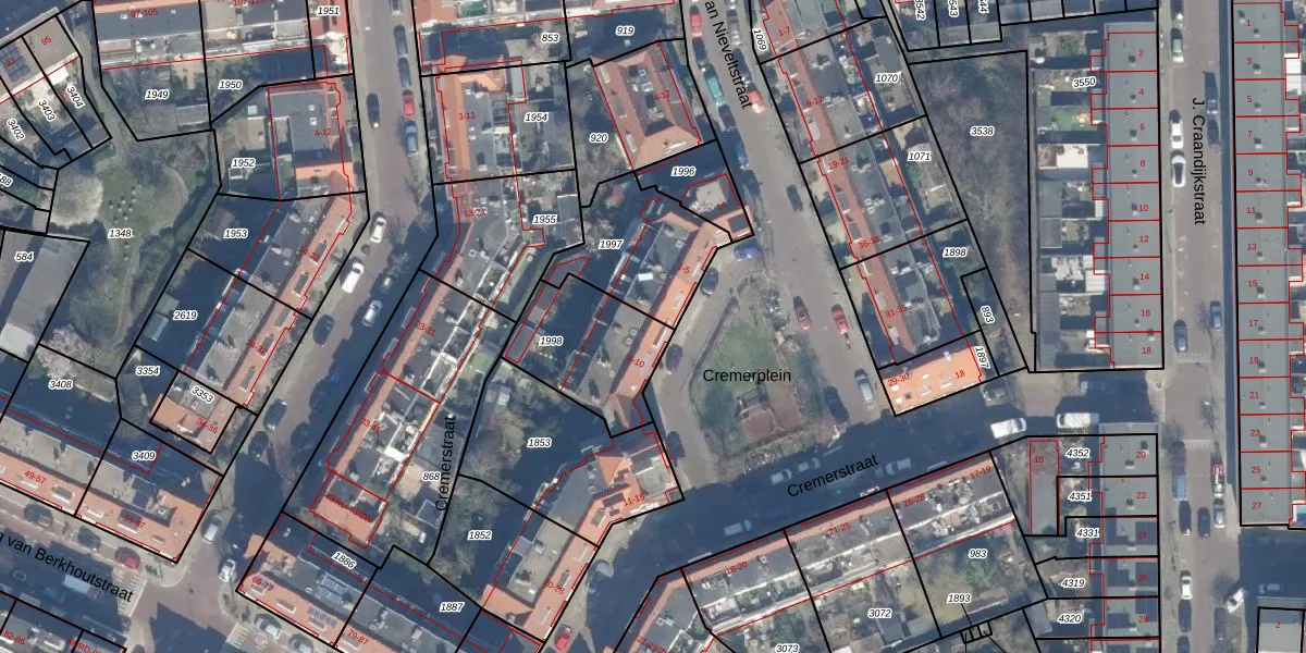 Het perceel waarop Cremerplein 6 staat heeft een oppervlakte van 382 m². Dit is een groot perceel. De perceeloppervlakte wordt geregistreerd door het Kadaster. Gedetailleerde informatie over de maten van dit perceel kunt u vinden in het rapport Kadastrale kaart met maatvoering van Cremerplein 6.