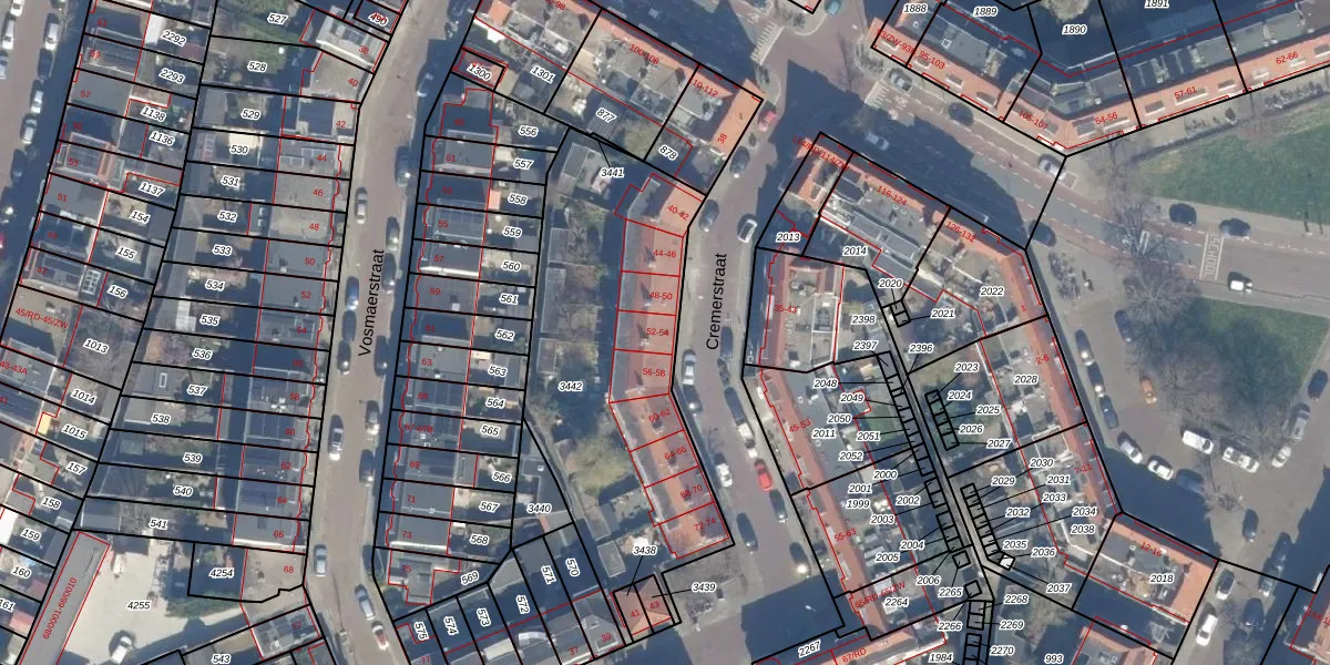 Cremerstraat 54 is gelegen op kadastraal perceel HLM02P3442. Deze kadastrale aanduiding is uniek en wordt gebruikt door het Kadaster om eigendomsrechten en andere zakelijke rechten vast te leggen. Het perceel maakt onderdeel uit van de kadastrale gemeente Haarlem.