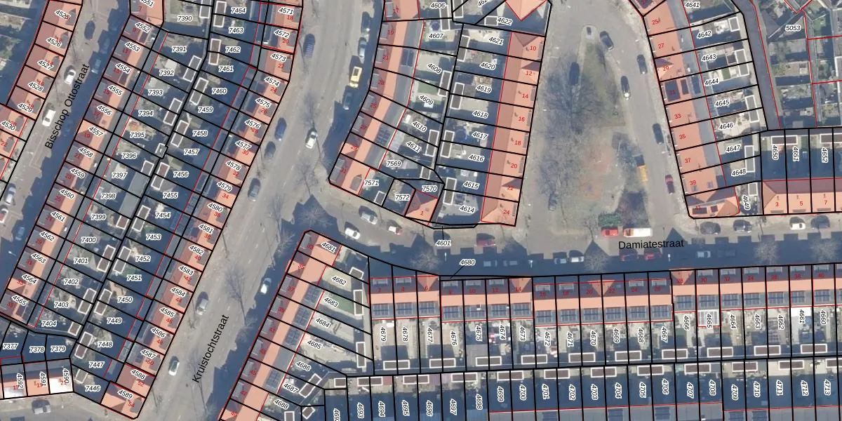 Het perceel waarop Damiatestraat 1 staat heeft een oppervlakte van 63 m². Dit is een klein perceel. De perceeloppervlakte wordt geregistreerd door het Kadaster. Gedetailleerde informatie over de maten van dit perceel kunt u vinden in het rapport Kadastrale kaart met maatvoering van Damiatestraat 1.