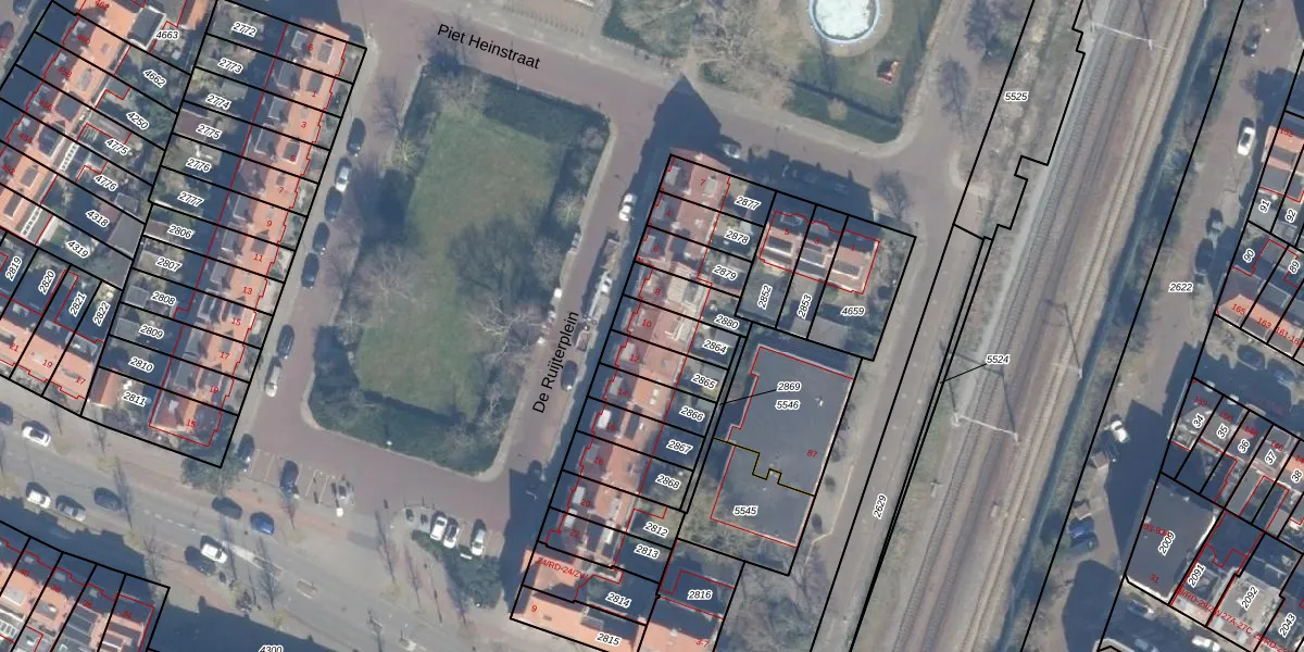 Het perceel waarop De Ruijterplein 10 staat heeft een oppervlakte van 107 m². Dit is een middelgroot perceel. De perceeloppervlakte wordt geregistreerd door het Kadaster. Gedetailleerde informatie over de maten van dit perceel kunt u vinden in het rapport Kadastrale kaart met maatvoering van De Ruijterplein 10.