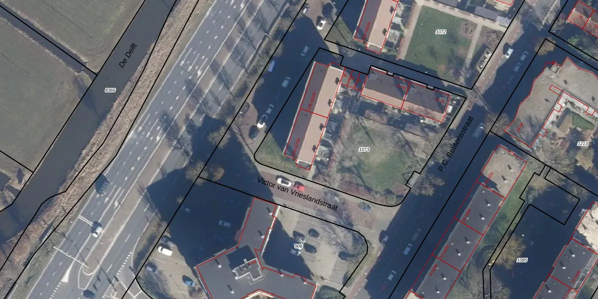 Het perceel waarop Delftlaan 425-I staat heeft een oppervlakte van 2185 m². Dit is een zeer groot perceel. De perceeloppervlakte wordt geregistreerd door het Kadaster. Gedetailleerde informatie over de maten van dit perceel kunt u vinden in het rapport Kadastrale kaart met maatvoering van Delftlaan 425-I.