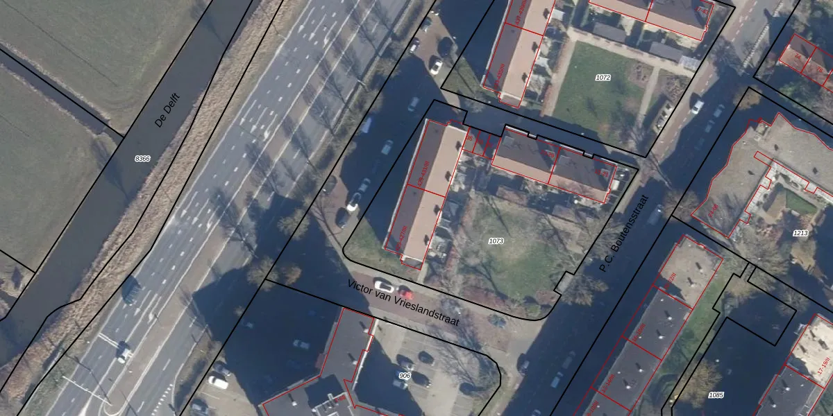 Het perceel waarop Delftlaan 427-I staat heeft een oppervlakte van 2185 m². Dit is een zeer groot perceel. De perceeloppervlakte wordt geregistreerd door het Kadaster. Gedetailleerde informatie over de maten van dit perceel kunt u vinden in het rapport Kadastrale kaart met maatvoering van Delftlaan 427-I.