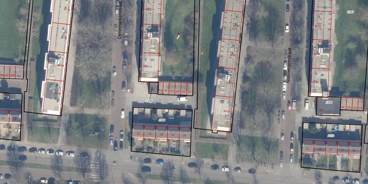 Het perceel waarop Denemarkenstraat 105 staat heeft een oppervlakte van 6590 m². Dit is een zeer groot perceel. De perceeloppervlakte wordt geregistreerd door het Kadaster. Gedetailleerde informatie over de maten van dit perceel kunt u vinden in het rapport Kadastrale kaart met maatvoering van Denemarkenstraat 105.