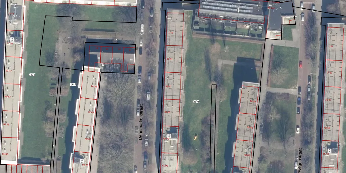 Het perceel waarop Denemarkenstraat 39 staat heeft een oppervlakte van 6590 m². Dit is een zeer groot perceel. De perceeloppervlakte wordt geregistreerd door het Kadaster. Gedetailleerde informatie over de maten van dit perceel kunt u vinden in het rapport Kadastrale kaart met maatvoering van Denemarkenstraat 39.