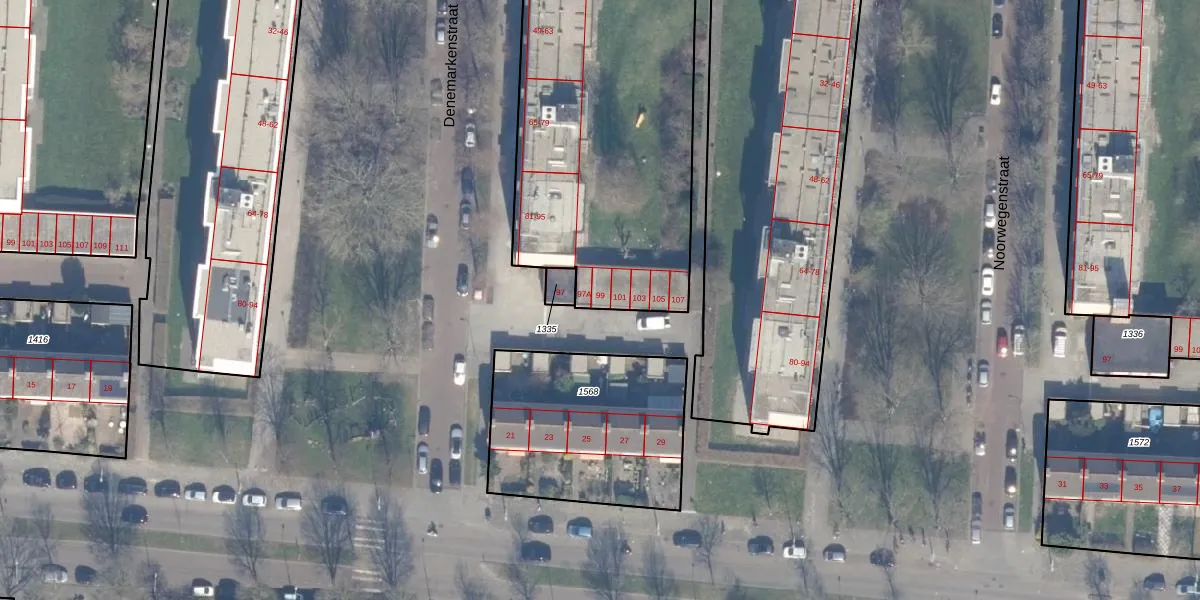 Het perceel waarop Denemarkenstraat 99 staat heeft een oppervlakte van 6590 m². Dit is een zeer groot perceel. De perceeloppervlakte wordt geregistreerd door het Kadaster. Gedetailleerde informatie over de maten van dit perceel kunt u vinden in het rapport Kadastrale kaart met maatvoering van Denemarkenstraat 99.