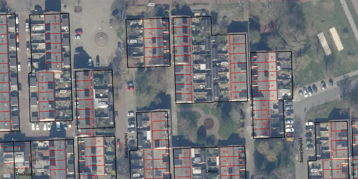 Het perceel waarop Dever 15 staat heeft een oppervlakte van 1712 m². Dit is een zeer groot perceel. De perceeloppervlakte wordt geregistreerd door het Kadaster. Gedetailleerde informatie over de maten van dit perceel kunt u vinden in het rapport Kadastrale kaart met maatvoering van Dever 15.