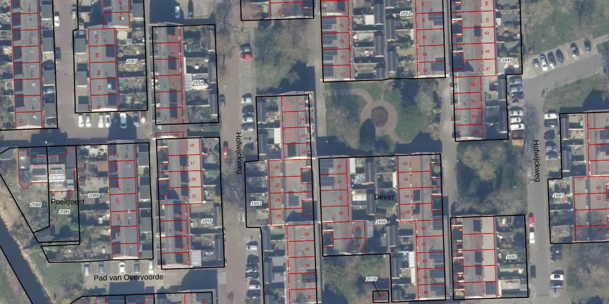Het perceel waarop Dever 18 staat heeft een oppervlakte van 1296 m². Dit is een zeer groot perceel. De perceeloppervlakte wordt geregistreerd door het Kadaster. Gedetailleerde informatie over de maten van dit perceel kunt u vinden in het rapport Kadastrale kaart met maatvoering van Dever 18.