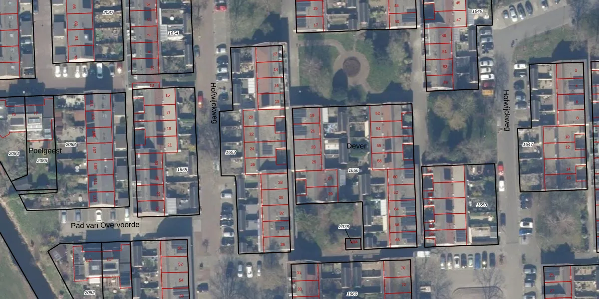 Het perceel waarop Dever 23 staat heeft een oppervlakte van 1564 m². Dit is een zeer groot perceel. De perceeloppervlakte wordt geregistreerd door het Kadaster. Gedetailleerde informatie over de maten van dit perceel kunt u vinden in het rapport Kadastrale kaart met maatvoering van Dever 23.