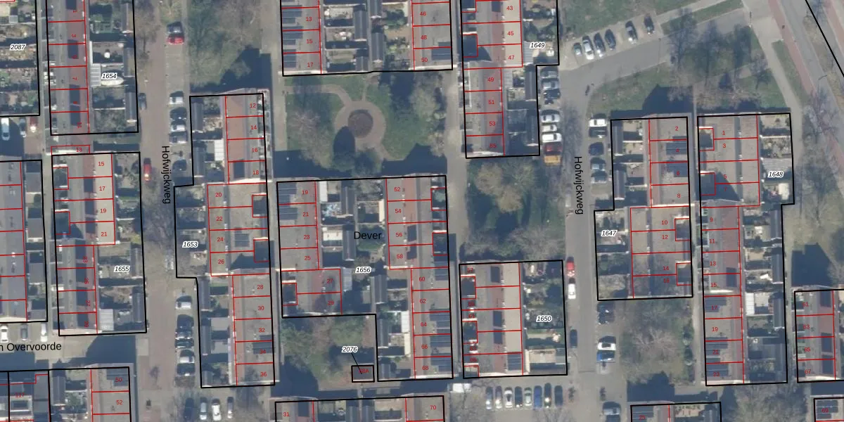 Het perceel waarop Dever 54 staat heeft een oppervlakte van 1564 m². Dit is een zeer groot perceel. De perceeloppervlakte wordt geregistreerd door het Kadaster. Gedetailleerde informatie over de maten van dit perceel kunt u vinden in het rapport Kadastrale kaart met maatvoering van Dever 54.