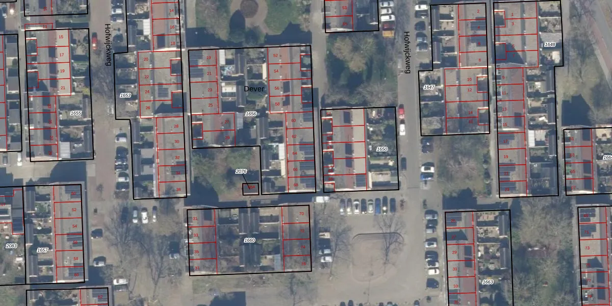 Het perceel waarop Dever 64 staat heeft een oppervlakte van 1564 m². Dit is een zeer groot perceel. De perceeloppervlakte wordt geregistreerd door het Kadaster. Gedetailleerde informatie over de maten van dit perceel kunt u vinden in het rapport Kadastrale kaart met maatvoering van Dever 64.