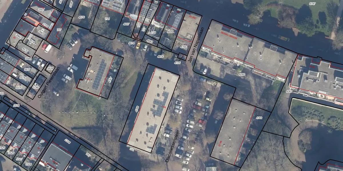 Het perceel waarop Diaconessenplein 36 staat heeft een oppervlakte van 958 m². Dit is een groot perceel. De perceeloppervlakte wordt geregistreerd door het Kadaster. Gedetailleerde informatie over de maten van dit perceel kunt u vinden in het rapport Kadastrale kaart met maatvoering van Diaconessenplein 36.