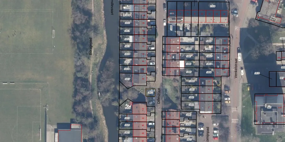Het perceel waarop Dillestraat 38 staat heeft een oppervlakte van 135 m². Dit is een middelgroot perceel. De perceeloppervlakte wordt geregistreerd door het Kadaster. Gedetailleerde informatie over de maten van dit perceel kunt u vinden in het rapport Kadastrale kaart met maatvoering van Dillestraat 38.