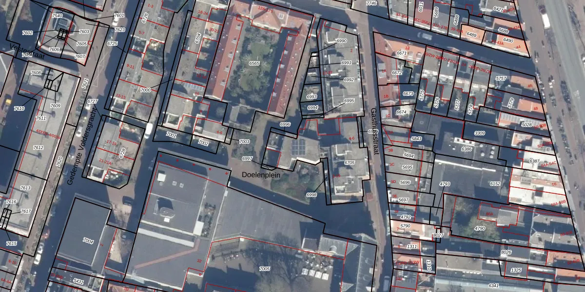 Het perceel waarop Doelenplein 13 staat heeft een oppervlakte van 1055 m². Dit is een zeer groot perceel. De perceeloppervlakte wordt geregistreerd door het Kadaster. Gedetailleerde informatie over de maten van dit perceel kunt u vinden in het rapport Kadastrale kaart met maatvoering van Doelenplein 13.