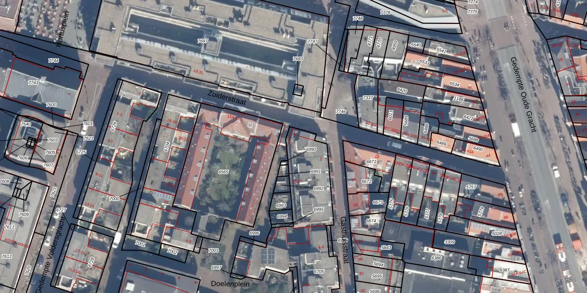 Het perceel waarop Doelenplein 21 staat heeft een oppervlakte van 1055 m². Dit is een zeer groot perceel. De perceeloppervlakte wordt geregistreerd door het Kadaster. Gedetailleerde informatie over de maten van dit perceel kunt u vinden in het rapport Kadastrale kaart met maatvoering van Doelenplein 21.