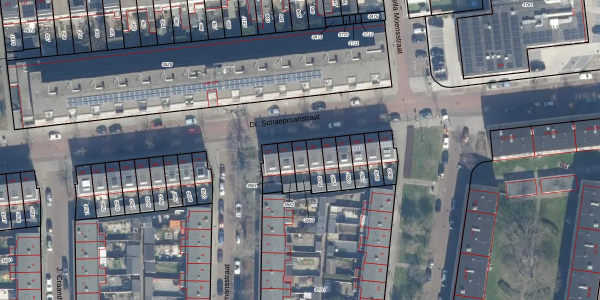 Dr. Schaepmanstraat 181 is gelegen op kadastraal perceel HLM02P3563. Deze kadastrale aanduiding is uniek en wordt gebruikt door het Kadaster om eigendomsrechten en andere zakelijke rechten vast te leggen. Het perceel maakt onderdeel uit van de kadastrale gemeente Haarlem.