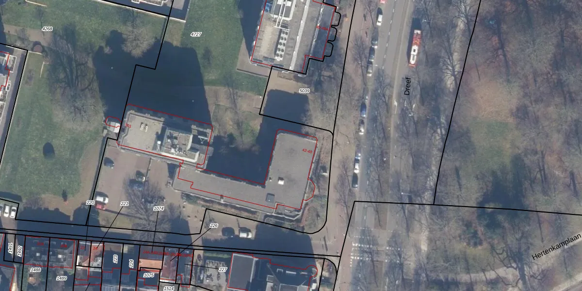 Het perceel waarop Dreef 42 staat heeft een oppervlakte van 6070 m². Dit is een zeer groot perceel. De perceeloppervlakte wordt geregistreerd door het Kadaster. Gedetailleerde informatie over de maten van dit perceel kunt u vinden in het rapport Kadastrale kaart met maatvoering van Dreef 42.