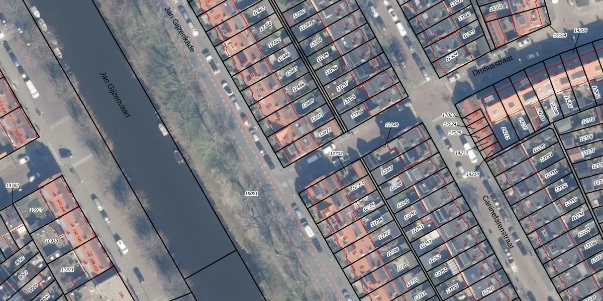 Het perceel waarop Drususstraat 1 staat heeft een oppervlakte van 137 m². Dit is een middelgroot perceel. De perceeloppervlakte wordt geregistreerd door het Kadaster. Gedetailleerde informatie over de maten van dit perceel kunt u vinden in het rapport Kadastrale kaart met maatvoering van Drususstraat 1.