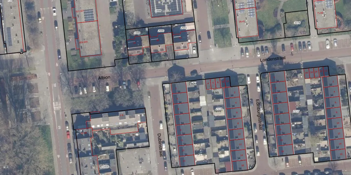 Het perceel waarop Dublinstraat 1 staat heeft een oppervlakte van 2380 m². Dit is een zeer groot perceel. De perceeloppervlakte wordt geregistreerd door het Kadaster. Gedetailleerde informatie over de maten van dit perceel kunt u vinden in het rapport Kadastrale kaart met maatvoering van Dublinstraat 1.