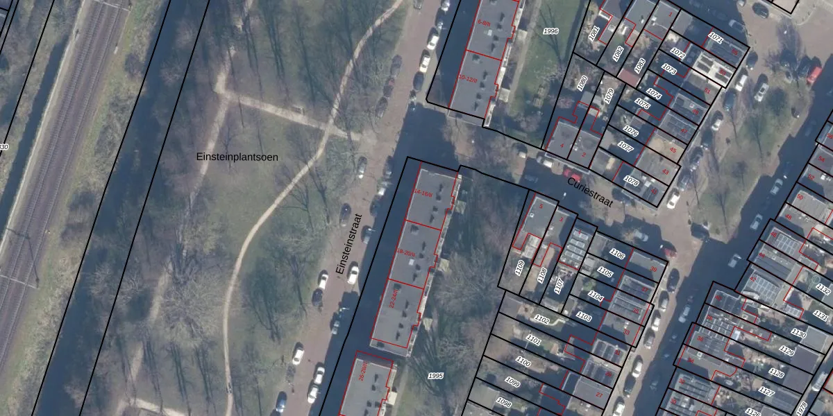 Het perceel waarop Einsteinstraat 16 staat heeft een oppervlakte van 3582 m². Dit is een zeer groot perceel. De perceeloppervlakte wordt geregistreerd door het Kadaster. Gedetailleerde informatie over de maten van dit perceel kunt u vinden in het rapport Kadastrale kaart met maatvoering van Einsteinstraat 16.
