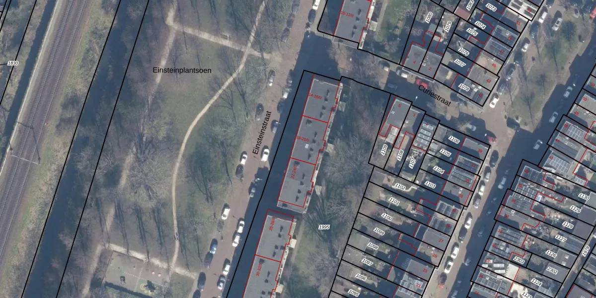 Het perceel waarop Einsteinstraat 20 staat heeft een oppervlakte van 3582 m². Dit is een zeer groot perceel. De perceeloppervlakte wordt geregistreerd door het Kadaster. Gedetailleerde informatie over de maten van dit perceel kunt u vinden in het rapport Kadastrale kaart met maatvoering van Einsteinstraat 20.
