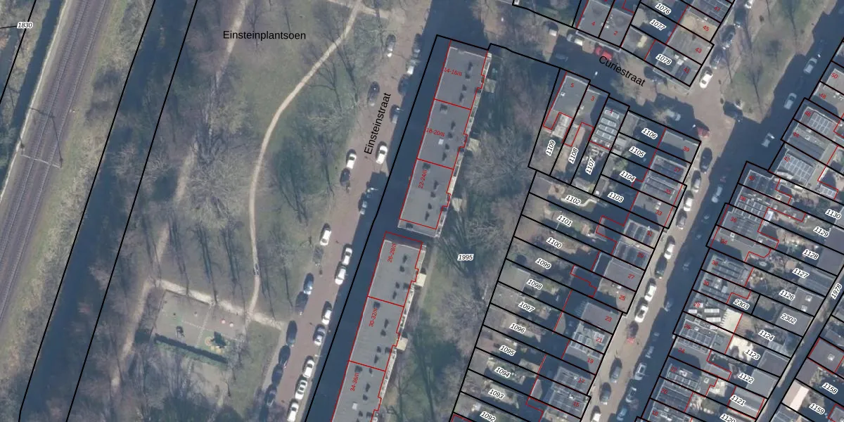 Het perceel waarop Einsteinstraat 24-I staat heeft een oppervlakte van 3582 m². Dit is een zeer groot perceel. De perceeloppervlakte wordt geregistreerd door het Kadaster. Gedetailleerde informatie over de maten van dit perceel kunt u vinden in het rapport Kadastrale kaart met maatvoering van Einsteinstraat 24-I.