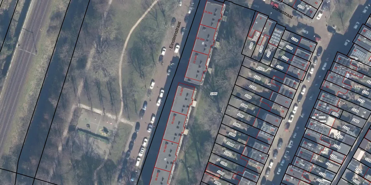 Het perceel waarop Einsteinstraat 26-I staat heeft een oppervlakte van 3582 m². Dit is een zeer groot perceel. De perceeloppervlakte wordt geregistreerd door het Kadaster. Gedetailleerde informatie over de maten van dit perceel kunt u vinden in het rapport Kadastrale kaart met maatvoering van Einsteinstraat 26-I.