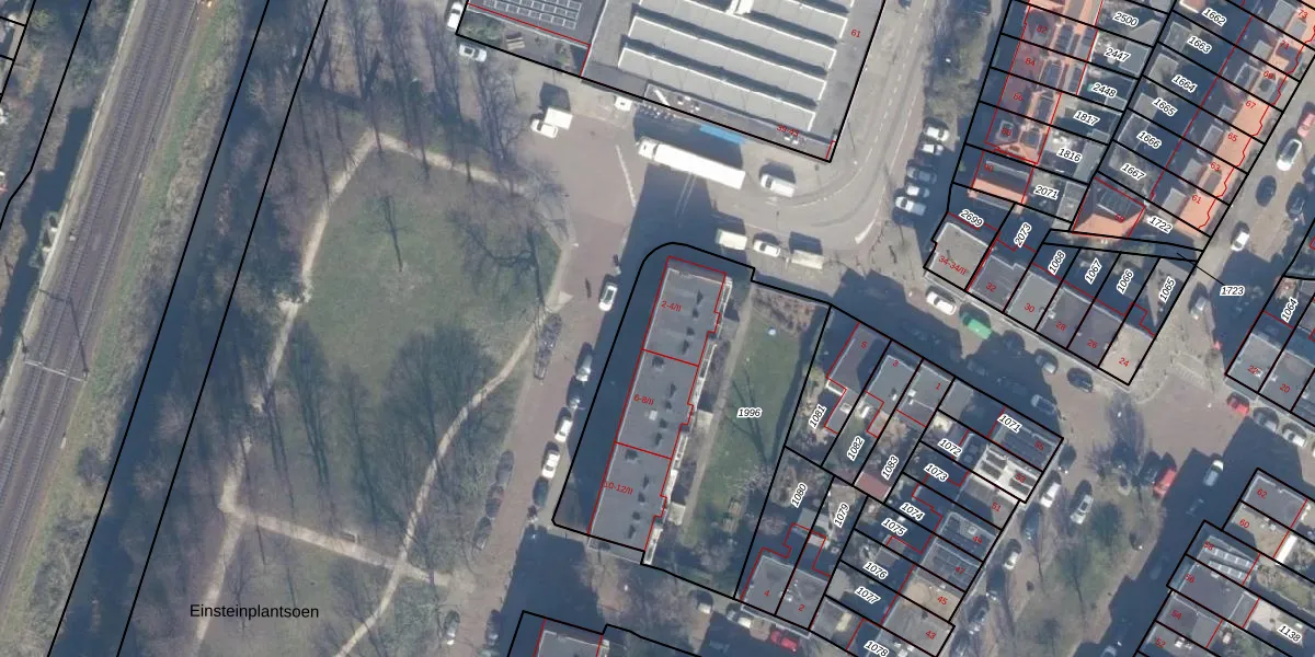 Het perceel waarop Einsteinstraat 4 staat heeft een oppervlakte van 1408 m². Dit is een zeer groot perceel. De perceeloppervlakte wordt geregistreerd door het Kadaster. Gedetailleerde informatie over de maten van dit perceel kunt u vinden in het rapport Kadastrale kaart met maatvoering van Einsteinstraat 4.
