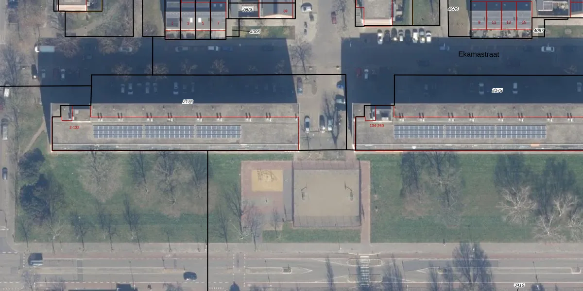 Het perceel waarop Ekamastraat 132 staat heeft een oppervlakte van 2474 m². Dit is een zeer groot perceel. De perceeloppervlakte wordt geregistreerd door het Kadaster. Gedetailleerde informatie over de maten van dit perceel kunt u vinden in het rapport Kadastrale kaart met maatvoering van Ekamastraat 132.