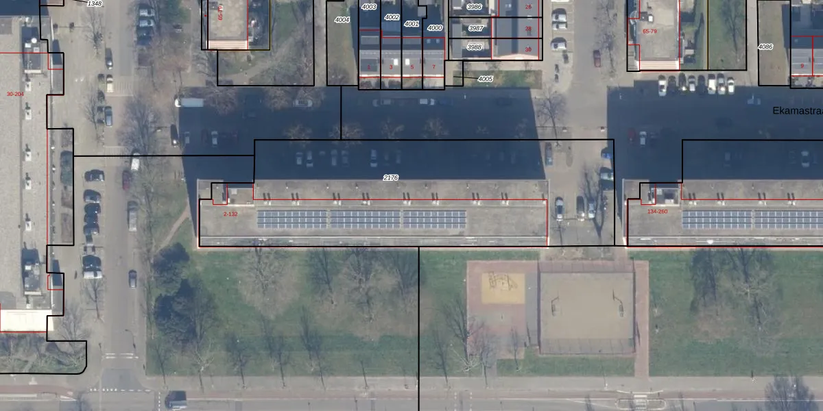 Het perceel waarop Ekamastraat 30 staat heeft een oppervlakte van 2474 m². Dit is een zeer groot perceel. De perceeloppervlakte wordt geregistreerd door het Kadaster. Gedetailleerde informatie over de maten van dit perceel kunt u vinden in het rapport Kadastrale kaart met maatvoering van Ekamastraat 30.