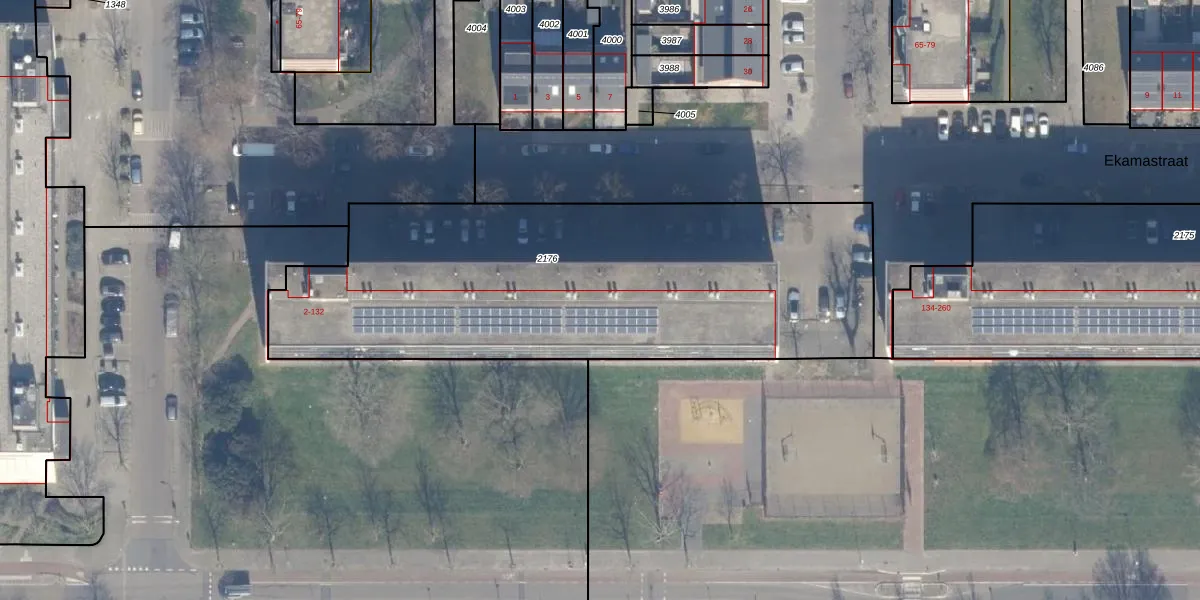 Het perceel waarop Ekamastraat 32 staat heeft een oppervlakte van 2474 m². Dit is een zeer groot perceel. De perceeloppervlakte wordt geregistreerd door het Kadaster. Gedetailleerde informatie over de maten van dit perceel kunt u vinden in het rapport Kadastrale kaart met maatvoering van Ekamastraat 32.