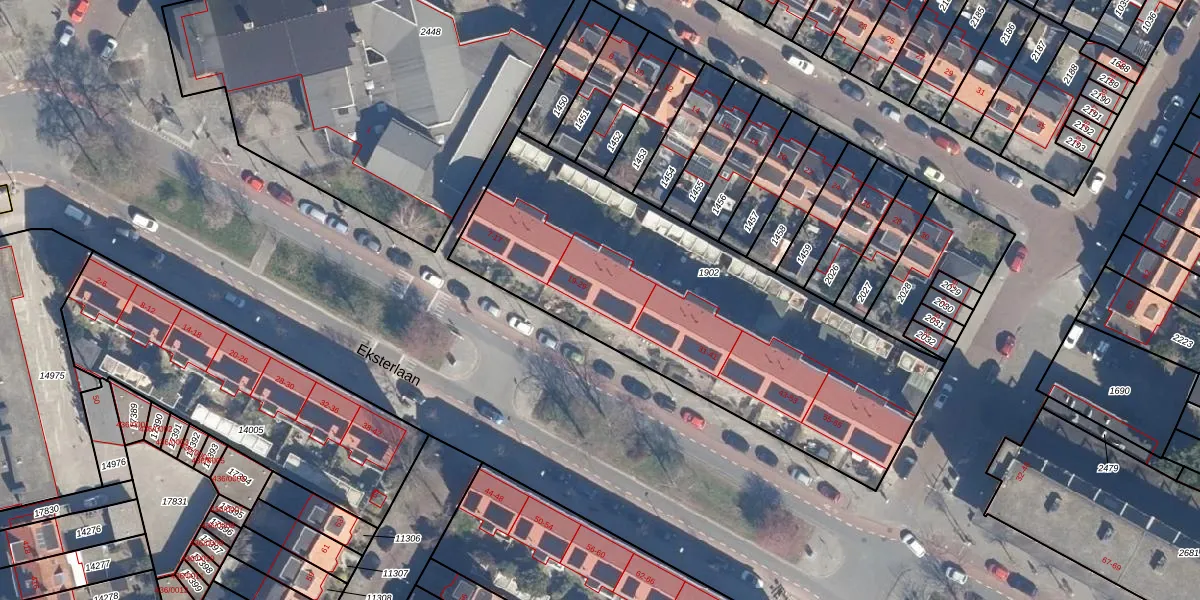 Het perceel waarop Eksterlaan 25 staat heeft een oppervlakte van 1970 m². Dit is een zeer groot perceel. De perceeloppervlakte wordt geregistreerd door het Kadaster. Gedetailleerde informatie over de maten van dit perceel kunt u vinden in het rapport Kadastrale kaart met maatvoering van Eksterlaan 25.