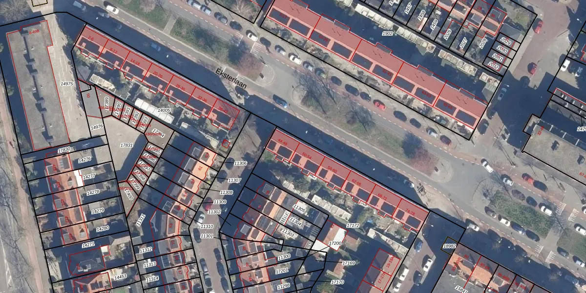 Het perceel waarop Eksterlaan 48 staat heeft een oppervlakte van 1955 m². Dit is een zeer groot perceel. De perceeloppervlakte wordt geregistreerd door het Kadaster. Gedetailleerde informatie over de maten van dit perceel kunt u vinden in het rapport Kadastrale kaart met maatvoering van Eksterlaan 48.