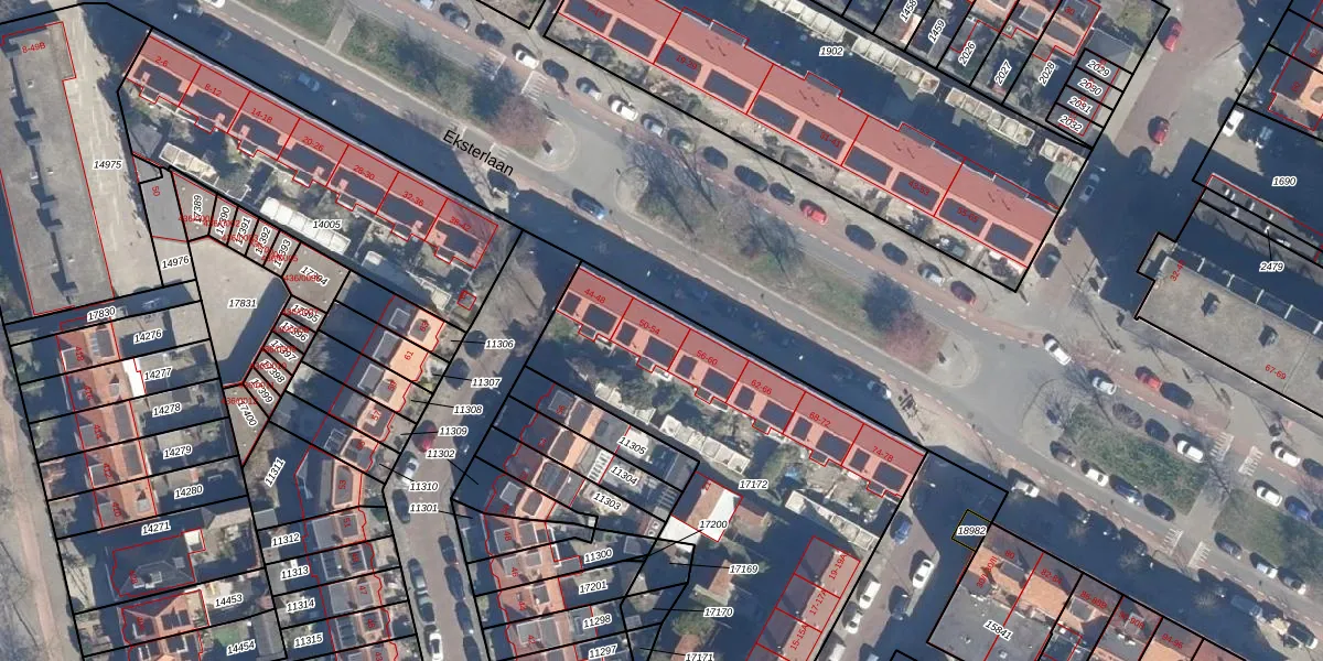 Het perceel waarop Eksterlaan 52 staat heeft een oppervlakte van 1955 m². Dit is een zeer groot perceel. De perceeloppervlakte wordt geregistreerd door het Kadaster. Gedetailleerde informatie over de maten van dit perceel kunt u vinden in het rapport Kadastrale kaart met maatvoering van Eksterlaan 52.