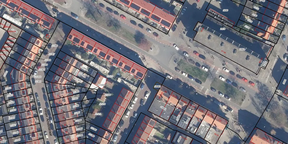 Het perceel waarop Eksterlaan 78 staat heeft een oppervlakte van 1955 m². Dit is een zeer groot perceel. De perceeloppervlakte wordt geregistreerd door het Kadaster. Gedetailleerde informatie over de maten van dit perceel kunt u vinden in het rapport Kadastrale kaart met maatvoering van Eksterlaan 78.