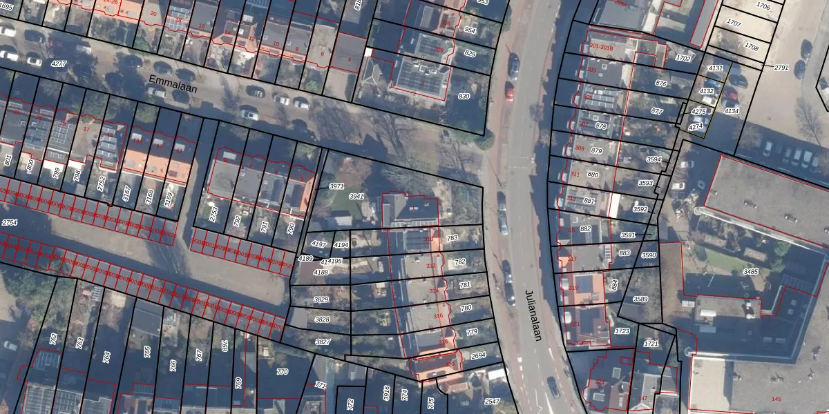 Het perceel waarop Emmalaan 1 staat heeft een oppervlakte van 593 m². Dit is een groot perceel. De perceeloppervlakte wordt geregistreerd door het Kadaster. Gedetailleerde informatie over de maten van dit perceel kunt u vinden in het rapport Kadastrale kaart met maatvoering van Emmalaan 1.